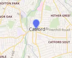 The Broadway Theatre (formerly known as the Lewisham Theatre) is a theatre on Rushey Green, Catford, in the London Borough of Lewisham. A grade II listed building,[1] the theatre was built in 1932 and is an example of Art Deco design. It has two auditoriums, an 800-seat main theatre and a small 80-seat studio theatre. The theatre's programme consists of a diverse mix of theatre and music, including stand up comedy, nostalgia shows, pantomime, drama and children's theatre.