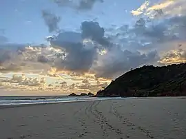 Broken Head is a coastal feature (promontory/headland) and suburb located in the Northern Rivers region of New South Wales, Australia, approximately 9 km south of Cape Byron, the easternmost point of Australia, the closest town being Byron Bay. Immediately adjacent is the 98-hectare (240-acre) Broken Head Nature Reserve which contains an intact segment of littoral rainforest. The suburb of Broken Head contained a population of 225 at the 2011 national census,[1] and in addition supports some tourist accommodation and a campsite. The area is noted for its Aboriginal culture, rainforest walks, whale watching and fishing from pristine beaches,[2] and it is also highly regarded as a surfing locality.[3][4] The Broken Head Holiday Park is currently administered by the indigenous Arakwal people, having been passed to their control by the New South Wales Crown Lands Department in 2009.[5]