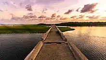 Broken Bridge is a bridge to nowhere, located in Chennai, South India. During the year 1977, the bridge partly collapsed due to strong currents of the river, and has never been repaired. The bridge spans across the Adyar estuary, bordering the backend of the Theosophical Society. It was built to facilitate the movement of fishermen from Santhome to Elliot's Beach over the mouth of the Adyar river.