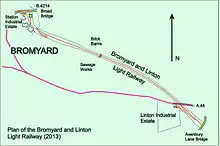 The Bromyard and Linton Light Railway is a 1-mile (1.6 km) single track, 2 ft (610 mm) narrow gauge railway line that runs between Bromyard and the Linton Industrial Estate, just off the A44. The track is laid on the bed of the old BR Worcester, Bromyard and Leominster Railway line. The track runs from an old depot, close to the site of the old Bromyard station, and ends under a bridge near a hospital turned flat block. The bridge was constructed in 1877 and carries a lane. There are disused engines in sheds at the main depot and Linton depot. The present track was used for the disused sandstone quarry.