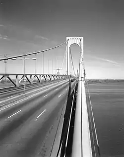 Even so, the public was scared by the fact that the two bridges were similar in design, and this led to a belief that the Whitestone Bridge might be unstable, as Moses later related.[4]: 124 [79] Shortly after the Tacoma Narrows Bridge collapse, Moses announced that steel cable stays would be installed on the bridge's towers to reduce oscillation.[80][8] To mitigate the risk of failure from high winds, eight stay cables, two on each side of both suspension towers, were proposed for installation.[4]: 124 Although $1 million was initially allocated for the bridge-stiffening project, construction was deferred due to material and labor shortages during World War II.[81] Planning for the project resumed in September 1945 at the end of the war,[82] and a low bidder for the project was announced that November.[83] The project's primary goal was to reinforce the bridge with trusses, thus ensuring the bridge's stability. The four lanes of roadway traffic were widened to six lanes, with the two additional lanes replacing the pedestrian walkways on each side. On both sides of the deck, 14-foot (4.3 m)-high steel trusses were installed to weigh down and stiffen the bridge in an effort to reduce oscillation. The stiffening project was completed in 1947.[7][8]