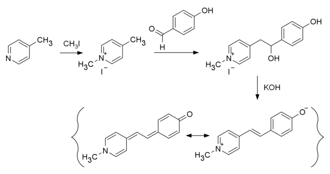 Brooker's merocyanine can be prepared beginning with the methylation of 4-methylpyridine to produce 1,4-dimethylpyridinium iodide. Base catalyzed reaction with 4-hydroxybenzaldehyde and subsequent intramolecular dehydration provides Brooker's merocyanine.