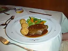 In Danish cuisine brown sauce (brun sovs) is a very common sauce, and refers to a sauce with a meat stock base (in modern times, often replaced by broth made from bouillon cubes), thickened by a roux, and sometimes colored a rich, deep brown with a product consisting of dark caramelized sugar, known as brun kulør (literally, "brown colouring") or madkulør (literally, "food colouring") or collorit soya (in Sweden). It is similar to what is known in the UK as gravy browning and in the U.S. as a brown gravy. Variations include mushroom sauce, onion sauce, and herbed brown sauce.[2]