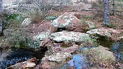 Part of the Atlantic coastal plain, Broxton Rocks' sandstone layers were created by the slow erosion of the Altamaha Formation, dating from the Middle Miocene era.[3] Fractures have opened up throughout the feature, some wide enough to allow a person to walk through, some narrow but deep. Where the waters of Rocky Creek, a first-order intermittent stream, drop to a lower level, a 10-foot (3 meter) waterfall has formed a pool in the sandstone before it flows out and through the lower reaches of the feature before draining into the Ocmulgee River.