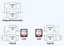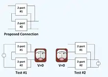 To check if two two-port networks can be connected in a parallel-parallel configuration, first of all just the input ports are connected in parallel, a voltage is applied to the input and the open-circuit voltage is measured/calculated between the outputs that are short-circuited each. If there is a voltage drop, the two-port networks cannot be combined in parallel. The same test is repeated from the output side of the two-port networks (parallel connection of the output ports, application of a voltage to the output, measurement/calculation of the open-circuit voltage between the inputs that are short-circuited each). Only if there is no voltage drop in both cases, a combination of the two-ports networks is permissible.
