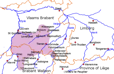 The county came to be claimed by the counts of Leuven and over several generations they achieved control of most of the area, excluding Hoegaarden, Beauvechain, Tourinnes-la-Grosse and Chaumont.[5] By 1155, if not earlier, Hoegaarden came to be seen as the chief town of the leftover "county", which remained under the bishops.[6]