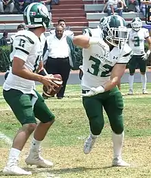 Márquez was hesitant to return for a second season due to the hits he took but decided to come back with Raptors de Naucalpan in 2017.[26] They defeated his former team, Condors, by a score of 13–10 in the first game of the season.[27] The following week he set new LFA records by throwing for 423 yards and five touchdowns in their 34–27 win against Dinos Saltillo.[28] He also set league records for longest play from scrimmage (a 94-yard pass to Enrique Barraza) and biggest comeback (27 unanswered points after a 20-point deficit).[28] Overall he led them to a 5–2 record before they were upset by Dinos Saltillo in the first round of the playoffs.[29] He was named league MVP after throwing for 1,543 yards and 15 touchdowns,[3] both league-leading numbers.[30]