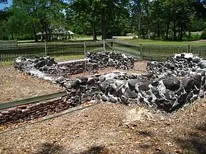 In 1899, the newly formed Cape Fear Chapter of the North Carolina Society of The Colonial Dames of America visited Brunswick Town to pay homage to Revolutionary War casualties. In 1902, the chapter erected a marble plaque inside the roofless ruins of St. Philip's to commemorate Brunswick Town founder Maurice Moore. In 1952, Dr. Lawrence Lee Jr. expressed interest in Brunswick Town and stated that the site should be excavated.[31] Dr. Lee was contracted by the State Department of Archives and History, now known as the Department of Cultural Resources, in 1958 to clear out the land and find the town ruins.[32] Dr. Lawrence Lee Jr. Requested the help of Archaeologist Stanley South. South began extensive excavations at Brunswick Town in 1958, and items such as bullets, buttons, and a cannonball were retrieved inside the St. Philip's Church ruins.[33] The remains of Brunswick Town are now a state historic site. Visitors may tour the town's remains and the earthworks of Fort Anderson.