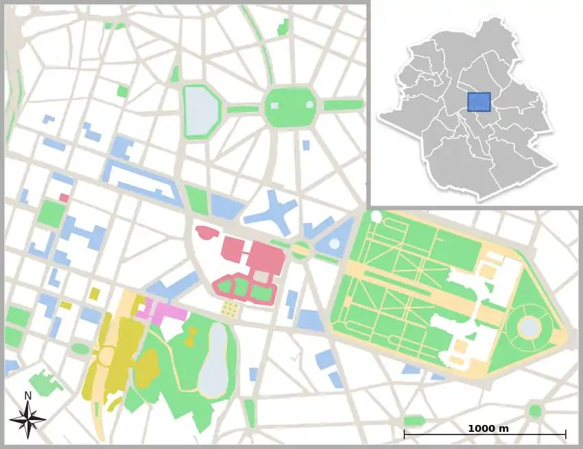 The area, much of which was known as the Leopold Quarter for much of its history, was historically residential, an aspect which was rapidly lost as the institutions moved in, although the change from a residential area to a more office oriented one had already been underway for some time before the arrival of the European institutions.[44] Historical and residential buildings, although still present, have been largely replaced by modern offices. These buildings were built not according to a high quality master plan or government initiative, but according to speculative private sector construction of office space, without which most buildings of the institutions would not have been built.[45] However, due to Brussels's attempts to consolidate its position, there was large government investment in infrastructure in the quarter.[22] Authorities are keen to stress that the previous chaotic development has ended, being replaced by planned architecture competitions[46] and a master plan (see "future" below).[47] Architect Benoit Moritz has argued that the area has been an elite enclave surrounded by poorer districts since the mid-19th century, and that the contrast today is comparable to an Indian city. However, he also said that the city has made progress over the last decade in mixing land uses, bringing in more businesses and residences, and that the institutions are more open to "interacting" with the city.[48]