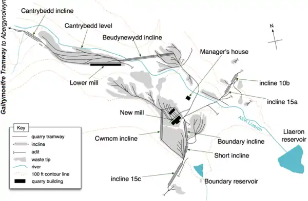 In 1844 John Pugh or Pughe obtained a quarrying lease from Lewis Morris, the owner of the Bryneglwys Estate, for a term of 50 years.[1] Pugh was a local miner from Aberdyfi, who already owned other mines in the locality, including the notable Dylife lead mine, which he owned, in association with Hugh Williams,[2] from 1809 until 1858.[3] In 1846 Pugh obtained another lease, for the Cantrybedd land on the opposite side of the valley.[1] Pugh began commercial-scale quarrying in 1847 (this is recorded on a stone plaque in the quarry).[4] He sank a shaft into the Narrow Vein, which is now known as the Daylight Adit, and built a small mill nearby, which he connected to the foot of the shaft by a level.[1] He transported the finished slates by pack horses for onward transport by ship, originally over the mountain ridge to the port of Pennal, and later to the port of Aberdyfi via the Fathew Valley and along the coast.[5][6][7]
