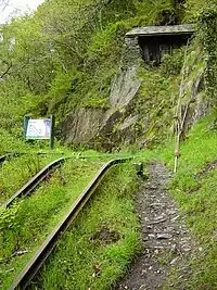 Bryn Eglwys was sold to the Forestry Commission, and the surviving quarry buildings were demolished in the early 1980s.[7] Some slates had already been removed from buildings in 1975–1976, and these were used as platform edging for extending the platform at Abergynolwyn.[13] A series of footpaths was created from Nant Gwernol[14] starting from the Alltwylt Incline and along the Galltymoelfre Tramway, though the path diverges from the Cantrybedd Incline due to a missing bridge.