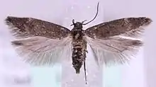 The wingspan is 11–13 mm. The forewings are glossy blackish brown and the hindwings are fuscous, but darker towards the apex.[2] Adults have been recorded on wing from early June to late August, probably in one generation per year.