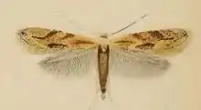 The wingspan is 7–9 mm.[2] The head is pale fuscous, mixed in middle with blackish. Forewings are brownish-whitish, irrorated with dark fuscous ; a more or less distinct dark streak along fold from base to near middle, often incomplete ; three oblique costal spots between 1/3 and apex, and a median dorsal spot suffusedly dark fuscous : second discal stigma forming a short blackish dash. Hindwings are grey.The larva is dull green, more yellowish above ; dorsal line darker ; dots yellowish and the head pale brown[3] Adults are on wing from mid-May to mid-August.[4] The larvae feed on Amelanchier, Chaenomeles, Cotoneaster, Crataegus douglasii, Crataegus laevigata, Crataegus monogyna, Cydonia oblonga, Malus domestica, Mespilus germanica, Prunus insititia, Prunus spinosa, Pyracantha coccinea, Pyrus communis, Sorbus aria, Sorbus aucuparia and Sorbus torminalis. They mine the leaves of their host plant. The mine has the form of a small, hook-like corridor, mostly in a vein axle. The frass is deposited in a thick central line. The larvae soon leave their mine and resumes feeding living freely on the leaf.[5] Larvae can be found from June to August. They are greenish yellow with a darker head. Pupation takes place in a white, ribbed cocoon on detritus.