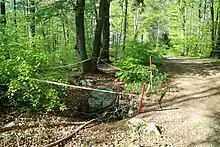 On the eastern foothill one of about 15 Roman grave fields in Graz has been excavated.[16] The grave field is known since the 15th century and is composed of at least 18 tumuli.[17] In the years 2003 and 2004 three of these tumuli were examined in detail for the first time ever. The middle one located at the edge of the forest turned out to be the most important one and revealed a completely preserved Roman grave for the first time in Graz.[14] The beehive-shaped grave was built of clay-smeared limestone and has a dromos and an almost unharmed grave chamber. The nearly round chamber with a diameter of 2.8 and a height of about 1.4 meters contained the remains of two or three funerals as well as intact grave goods. Along with a completely preserved tripod shell and the shards of a drinking cup the grave contained a copper or bronze coin with the face of Antoninus Pius which made it possible to date it back to the second century.[18] The type of grave installation has been called typical for the region of northeast Styria and Burgenland.[16] Both of the other graves were showing signs of looting but still contained fragments of a ceramic pot, broken glass and another coin. The first hill was roofed with a steel and glass construction and made visible for the public while the other two were filled up again.[18] Because of its great condition the grave field has been declared a cultural heritage monument.