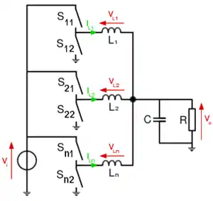 The multiphase buck converter is a circuit topology where basic buck converter circuits are placed in parallel between the input and load. Each of the n "phases" is turned on at equally spaced intervals over the switching period. This circuit is typically used with the synchronous buck topology, described above.