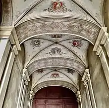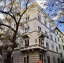 One of the lesser-known architects who designed buildings in the Palotanegyed's pre-World War One boom period was another Jewish architect, Adolf Greiner (born Losoncz, now Slovakia, 1847, died Budapest 1931). He designed the Újpest synagogue, built 1885-86, and a number of inner Pest apartment buildings in the 1890s, including the four-storey building at Horánszky utca 27, built in 1892.[19][20]