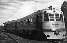 Budd revived its railcar concept after diesel engines with a suitable combination of power and weight became available in 1938, although with more conventional steel wheels. In 1941 Budd built the Prospector for the Denver and Rio Grande Western Railroad. This was a two-car diesel multiple unit.[9] Each car had a pair of 192 horsepower (143 kW) diesel engines and was capable of independent operation. The cars were constructed of stainless steel and included a mix of coach and sleeping accommodations. The design was popular with the public but undone by the difficult operating conditions on the D&RGW. It was withdrawn in July 1942, apparently another failure.[10] However, several technical advances during the Second World War encouraged Budd to try again.