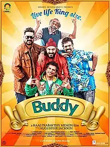 Buddy is a 2013 Indian Malayalam film written and directed by Raaj Prabavthy Menon. The film has been produced by Augustin Jackson and it features Anoop Menon, Bhumika Chawla, Balachandra Menon, Babu Antony, Asha Sarath, Srikanth, Arun Midhun and Mithun Murali.[2][3][4] Balachandra Menon made a comeback after a long time through this film. The film did fairly well at the box office.