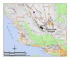 The Buena Vista Oil Field, formerly the Naval Petroleum Reserve No. 2 (NPR-2) is a large oil field in Kern County, San Joaquin Valley, California in the United States. Discovered in 1909, and having a cumulative production of approximately 667 million barrels (106,000,000 m3), it is the tenth-largest oil field in California. As of year end 2006 the field had a total reserve of only about one percent of its original oil, and having produced a mere 713,000 barrels (113,400 m3).[1] Since, the field has gone through a revitalization. Crimson Resources initiated a waterflood in the Etchegoin Formation, saw good response and sold the asset to Occidental Petroleum (now California Resources Corporation, CRC). CRC continued the development of the waterflood, but also tested the viability of the Monterey Formation. The Monterey Formation at Buena Vista has proven to be a viable target and is currently being developed.