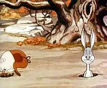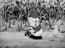 According to Chase Craig, who wrote and drew the first Bugs Bunny comic Sunday pages and the first Bugs comic book, "Bugs was not the creation of any one man; however, he rather represented the creative talents of perhaps five or six directors and many cartoon writers including Charlie Thorson.[9] In those days, the stories were often the work of a group who suggested various gags, bounced them around and finalized them in a joint story conference."[10] A rabbit with some of the personality of Bugs, though looking very different, was originally featured in the film Porky's Hare Hunt, released on April 30, 1938. It was co-directed by Ben "Bugs" Hardaway and an uncredited Cal Dalton (who was responsible for the initial design of the rabbit). This cartoon has an almost identical plot to Avery's Porky's Duck Hunt (1937), which had introduced Daffy Duck. Porky Pig is again cast as a hunter tracking a silly prey who is more interested in driving his pursuer insane and less interested in escaping. Hare Hunt replaces the little black duck with a small white rabbit. According to Friz Freleng, Hardaway and Dalton had decided to "dress the duck in a rabbit suit".[11] The white rabbit had an oval head and a shapeless body. In characterization, he was "a rural buffoon". Mel Blanc gave the character a voice and laugh much like those he later used for Woody Woodpecker. He was loud, zany with a goofy, guttural laugh.[12] The rabbit character was popular enough with audiences that the Termite Terrace staff decided to use it again.[13]