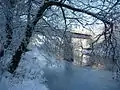 Railway bridge spanning the River Wye in the snow.