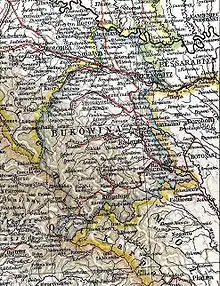 ![]() Location of Bukovina within northern Romania and neighbouring Ukraine | |