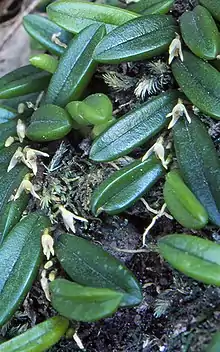 Bulbophyllum shepherdii, commonly known as the wheat-leaf rope orchid,[2] is a species of epiphytic or lithophytic orchid that forms a dense mat of branching rhizomes pressed against the surface on which it grows. The pseudobulbs are well spaced along the rhizome, each with a single egg-shaped leaf and a single small, white or cream-coloured flower with yellow tips. It grows on trees and rocks in rainforest and is endemic to eastern Australia.
