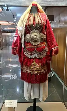 The Bulgarian national garbs appear from the Bulgarian National Revival to the middle of 20th century. The women's costume are composed of: pinafore, skirt, buckles, apron, Bulgarian jewelry and others. The men's costume are composed of: full-bottomed breeches, girdle, vest, shirt and others. During the Bulgarian National Revival Bulgarians manufactured themselves the Bulgarian national garb.[1]