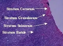 The epidermis is composed of four layers, stratum basale, stratum spinosum, stratum granulosum, and stratum corneum.[5]