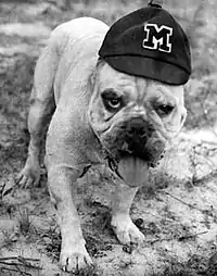 Bully is the official mascot of the Mississippi State University Bulldogs in Starkville, Mississippi, and the name is given to both the costumed mascot and the live bulldog that appears at State games. The live mascot Bully is an American Kennel Club registered English Bulldog,[1][2] and each dog is given the inherited title of "Bully". The name "Bully" is traditionally considered a title and not the official name of the specific dog that holds it.