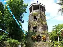 Near the community of Dapdap, a bigger triangular muralla [fortification] called Punta Diamante which encloses the church and rectory of the parish of St. James the Greater was erected. Punta Diamante has five watchtowers with high, thick walls, making it an ideal place for refuge during Moro attacks. Unlike the other watchtowers which are cylindrical and have circular bases, the one facing the sea is of a triangular plan, a smaller version of the main complex. The biggest watchtower has an octagon shaped base (with eight sides) and tapers upward in alternating tiers. This watchtower now serves as the church's bell tower, with the old bells comparably intact.[9]