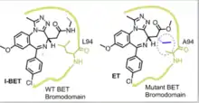 The BET (Bromodomains and Extra Terminal) family of proteins contain conserved motifs known as bromodomains (BDs) responsible for recognizing acetylated lysine on nucleosomal histones.[14] Recently, four members of the BET family, BRD2, 3, 4, and BRDT, each containing two bromodomains, were identified as important regulators of transcription.[15] In order to probe bromodomain-specific functions of members of the BET family, small-molecule inhibitors JQ1 and I-BET were developed, but they lacked inter- and intra-BET (between BDs on the same protein) selectivity.[16] The lab of Alessio Ciulli produced bump-and-hole pairs consisting of ET, a derivative of I-BET with an ethyl bump, and different members of the BET family with an L94A mutation in their BD1.[13] ET was found to have a 160-fold greater specificity for hole-modified BD1 of BET mutants compared to compared to the BDs of wild type BET proteins, giving BD-specific inhibition. The BD-ET bump-and-hole pairs were used to show that selective inhibition of BD1 in a BET protein disrupts chromatin engagement. Recently, the Ciulli group developed a new bump-and-hole pair consisting of BET mutants with a Leu to Val mutation in a BD and the bumped small-molecule inhibitor 9-ME-1. This bumped inhibitor was found to have an IC50 of 200nM and over 100-fold specificity for the L/V BET mutant BD over wild type BDs. This bump-and-hole pair allowed selective inhibition of specific BDs in specific BET proteins, elucidating their role in human cells. It was found that while BD1 is important for chromatin localization of BET proteins, BD2 regulates gene expression by binding and recruiting non-histone acetylated proteins, such as transcription factors.[17]