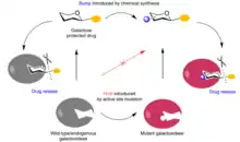 Glycosidases are a family of enzymes that catalyzes the hydrolysis of glycosidic bonds. These enzymes can cleave glycans from glycosylated proteins, one of the most common forms of post-translational modification. In a recent therapeutic application of the bump-and-hole method, a hole-modified galactosidase was paired with a bumped galactosyl-pro-drug. Jingli Hou and colleagues sought to deliver nitric oxide, an important messenger for promoting tissue growth processes like angiogenesis and vasculogenesis, in a spatiotemporally controlled manner. They opted for a pro-drug system, wherein the NO-releasing drug, NONOate, is initially glycosylated. Once the glycosylated NONOate enters cells and is exposed to glycosidases, NO is released. However, non-tissue-specific systemic release of NO, which can reduce therapeutic efficiency and cause harmful side effects, from these pro-drugs was evident due to widespread distribution of endogenous glycosidases. To get around this, Hou et al. developed a bumped pro-drug via methylation of the O6 of the galactose moiety of galactosyl-NONOate. They engineered a corresponding hole-modified β-galactosidase mutant, A4-β-GalH363A with specificity for the bumped galactosyl-NONOate. The bumped pro-drug evaded cleavage by wild type β-galactosidase due to the methylated O6 of the galactose moiety and strict regioselectivity of glycosidases. NO was released in tissues only in the presence of both the bumped galactosyl-NONOate and the hole-modified β-galactosidase mutant, giving spatiotemporal control of delivery. Hou et al. found markedly increased therapeutic efficiency of NO delivery via the bump-and-hole engineered system, compared to the unmodified pro-drug, in rat hindlimb ischemia and mouse acute kidney injury models.[18]