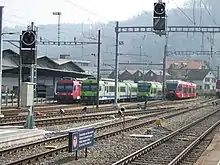 The municipality has four railway stations: Burgdorf, Burgdorf Steinhof, Burgdorf Buchmatt, and Oberburg. The first of these is a major railway junction, served by three different lines; the other three are located north and south of it on the Solothurn–Langnau line. Between them there is regular service to Zürich Hauptbahnhof, Olten, Bern, Thun, Langnau, Solothurn, and Sumiswald-Grünen.