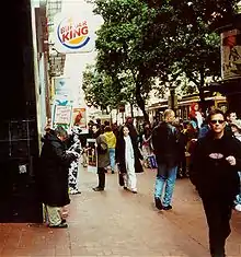 In 2001, the animal rights group PETA began targeting fast food chains in the United States regarding the treatment of chickens by suppliers such as Tyson Foods. Using parodies of corporate logos and slogans, the group sought to publicly embarrass the companies into changing their corporate policies in dealing with their poultry suppliers. After winning concessions from McDonald's with its "McCruelty" campaign, the group targeted Burger King with a six-month campaign it called Murder King.[2] The group and its supporters, with the backing of celebrities including Alec Baldwin, James Cromwell, and Richard Pryor,[3] staged protests outside Burger King restaurants across the United States, calling on the company to establish these new compliance guidelines.[4] On June 28, 2001, Burger King entered into an agreement with the group and established a contractual framework that defined procedures to ensure that its suppliers were conforming to the agreed-upon standards of animal welfare.[4] These changes, along with the company's new vegetarian offering, the BK Veggie sandwich, drew praise from the group.[5][6]