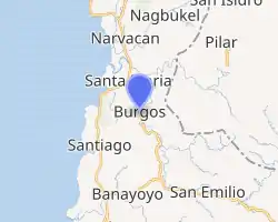 Burgos, officially the Municipality of Burgos (Ilocano: Ili ti Burgos; Filipino: Bayan ng Burgos) is a 4th class municipality in the province of Ilocos Sur, Philippines. According to the 2020 census, it has a population of 12,793 people. [3]