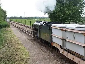 Officially opened on 16 July 1927, this station was then called Burmarsh for East Dymchurch and was equipped with two platforms, a booking office, a waiting room, and possibly a signal box (historical accounts vary on this last point, most suggesting the booking office housed a lever frame controlling just two signals). Later the station name was changed to Dymchurch Bay. Traffic levels fell sharply after the Second World War, and the station was eventually reduced in status to a halt and again renamed as Burmarsh Road Halt. It closed in 1948, re-opened in 1950, but finally closed again at the end of that same year, when the station buildings were demolished. The roof of the booking office was left in situ, on pillars (with the walls removed), to form a waiting shelter in the event of re-opening, but this structure was also demolished a few years later. However, the station was again re-opened on 7 September 1977 as the starting point of the school train service run for Kent County Council, transporting local children to Southlands Comprehensive School in New Romney. Declining use meant that the school train last ran on 24 July 2015.[1] As at 2018 the platforms remain in situ.