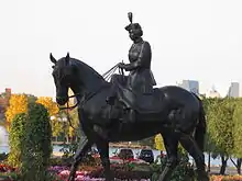 During Saskatchewan's centennial in 2005, the Queen unveiled a bronze statue in front of the Saskatchewan Legislative Building in Regina, Canada, where she is depicted atop Burmese.[7] The statue was sculpted by Saskatchewan artist Susan Velder.