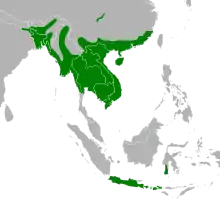The Burmese python occurs throughout Southern and Southeast Asia, including eastern India, southeastern Nepal, western Bhutan, southeastern Bangladesh, Myanmar, Thailand, Laos, Cambodia, Vietnam, northern continental Malaysia, and southern China in Fujian, Jiangxi, Guangdong, Hainan, Guangxi, and Yunnan.[19] It also occurs in Hong Kong, and in Indonesia on Java, southern Sulawesi, Bali, and Sumbawa.[20] It has also been reported in Kinmen.[21]