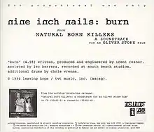 "Burn" is a song recorded by American industrial rock band Nine Inch Nails for the soundtrack to the 1994 film Natural Born Killers. It was released as a promotional single from the soundtrack. The song was included as a bonus track on the 10th anniversary deluxe edition of The Downward Spiral in 2004. Live performances of the song are featured on KROQ Christmas 2005 and the concert film Beside You in Time.