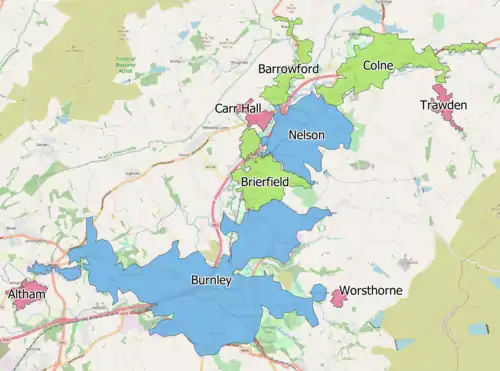 The Burnley Built-up area is an urban area or conurbation which extends from the town of Burnley to Padiham, Brierfield, Nelson, Barrowford and Colne in Lancashire, England.[1] The area takes in parts of the boroughs of Burnley and Pendle, and also small parts of Hyndburn and Ribble Valley. It also includes a number of villages such as Blacko, Trawden and Worsthorne. In 2011 the area was recorded at having a population of 149,422.[2] It is the third most populous urban area in Lancashire after Preston and Blackpool, with slightly more people than the urban areas of Cambridge or York.