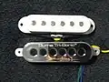 Comparison of the sizes of a Burns Tri-Sonic Brian May pickup (Bottom) and a standard Stratocaster style pickup (Top)