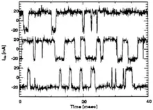 It consists of sudden step-like transitions between two or more discrete voltage or current levels, as high as several hundred microvolts, at random and unpredictable times. Each shift in offset voltage or current often lasts from several milliseconds to seconds, and sounds like popcorn popping if hooked up to an audio speaker.[2]