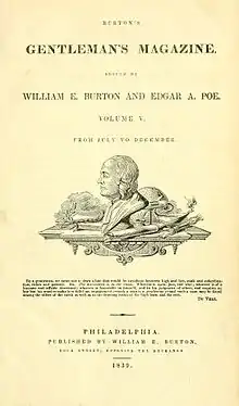 The magazine's most famous contributor and one-time editor was Edgar Allan Poe. Poe approached Burton to offer his services in May 1839.[3] The June issue of that year included the notice that its owner had "made arrangements with Edgar A. Poe, Esq., late Editor of the Southern Literary Messenger, to devote his abilities and experience to a portion of the Editorial duties of the Gentlemen's Magazine". Poe agreed to provide about 11 pages of original material per month and his name was added next to Burton's.[4] His role included editing articles and proofreading as well as original contributions like critical reviews.[2] Burton offered Poe $10 a week for his services and estimated he would need to dedicate only two hours a day.[5] In Burton's, Poe published now several of his own original tales including "The Man That Was Used Up" (August 1839), "The Fall of the House of Usher" (September 1839), "William Wilson" (October 1839), "Morella" (November 1839), "The Conversation of Eiros and Charmion" (December 1839) and "The Business Man" (February 1840).[2] Disagreements between the two caused Burton to fire Poe in June 1840.