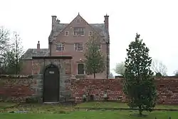 The house dates from the early 17th century, and was built by John Werden.[2] There have been some small 19th-century additions. It is built in brick with buff sandstone dressings, it has a Welsh slate roof, and four stone-capped brick chimneys. Its plan is square and the house has three storeys over a basement, with a symmetrical three-bay front. The entrance is approached by ten stone steps.[1] The garden walls and gateway are separately listed at Grade II.[3]