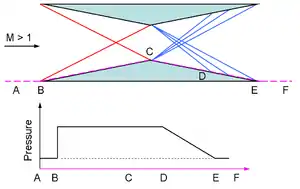 Supersonic flow around a conventional wing generates compressive sonic shock waves at the leading and trailing edges, with an expansion wave in between them. These shock waves correspond to pressure changes which impede airflow, known as wave drag. In the Busemann biplane, the forward high pressure shock wave is created internally and reflects symmetrically between double-wedge inner surfaces. These interfere to cancel out both themselves and the following shock waves, leaving no external wave to propagate to infinity and hence avoiding wave drag. The flat upper and lower surfaces generate no shock waves because the flow is parallel.