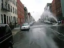 Newspapers around the country published UPI and the Associated Press's photos of Bushwick residents with stolen items and a police officer beating a suspected looter, and Bushwick became known for riots and looting.[51] Fires spread to many residential buildings as well. After the riots were over and the fires were put out, residents saw unsafe dwellings and empty lots among surviving buildings, leading one author to describe the scene as "some streets that looked like Brooklyn Heights, and others that looked like Dresden in 1945":[50]:181 The business vacancy rate on Broadway reached 43% in the wake of the riots.[46]