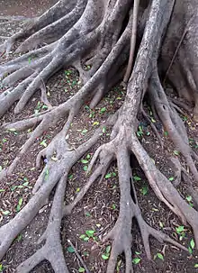 Buttress roots are large, wide roots on all sides of a shallowly rooted tree. Typically, they are found in nutrient-poor tropical forest soils that may not be very deep. They prevent the tree from falling over (hence the name buttress) while also gathering more nutrients. Buttresses are tension elements, being larger on the side away from the stress of asymmetrical canopies.[1] The roots may interwind with buttress roots from other trees and create an intricate mesh, which may help support trees surrounding it. They can grow up to 30 feet (9.1 m) tall and spread for 30 metres above the soil then for another 30 metres below. When the roots spread horizontally, they are able to cover a wider area for collecting nutrients. They stay near the upper soil layer because all the main nutrients are found there.[2] Buttress roots vary greatly in size from barely discernable to many square yards (square meters) of surface. The largest for which there is photographic evidence is a Moreton Bay Fig (Ficus macrophylla) at Fig Tree Pocket (an outlying district of Brisbane, Queensland) which was photographed in 1866 with an adult man. The buttresses were forty to fifty feet (12 to 15 meters) long and thirty-five to forty feet (11 to 12 meters)in height.[3] Halfway out the buttress is still twice the height of the man. It died in 1893 from flood damage. The tallest buttresses are those of Huberodendron duckei (Bombacaceae) of the Amazon Basin which extend up to seventy feet (21 meters) up a tree about 145 feet (44 meters) in height.[4] The most extensive buttresses are those of Kapok, or Silk Cotton Tree (Ceiba pentandra) of the Neotropics and tropical Africa. The buttresses can extend up to sixty-five feet (twenty meters) from the tree as buttresses, then continue as superficial roots for a total of 165 feet (fifty meters).[5]