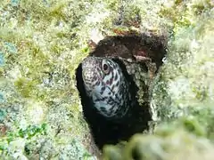 Spotted moray (Gymnothorax moringa) in Playa Buyé. The beach area offers opportunities to see marine wildlife.