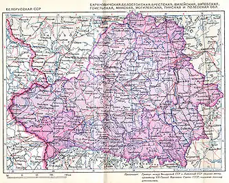 Byelorussia (also known as the Byelorussian Soviet Socialist Republic), known today as Belarus, was a republic of the Soviet Union when World War II began. The borders of Belarus were greatly expanded in the invasion of Poland of 1939 and finalised after World War II. Following the German military disasters at Stalingrad and Kursk, a collaborationist Belorussian self-government (BCR) was formed by the Germans in order to drum up local support for their anti-Soviet operations. The Belorussian BCR in turn formed the twenty-thousand strong Belarusian Home Defence (BKA), active from 23 February 1944 to 28 April 1945.[1] Assistance was offered by the local administrative governments from the Soviet era, and prewar public organizations including the former Soviet Belarusian Youth.[2] The country was soon overrun by the Red Army. Devastated by the war, Belarus lost significant populations and economic resources. Many battles occurred in Belarusian and neighbouring territory. Belarusians also participated in regional conflicts.